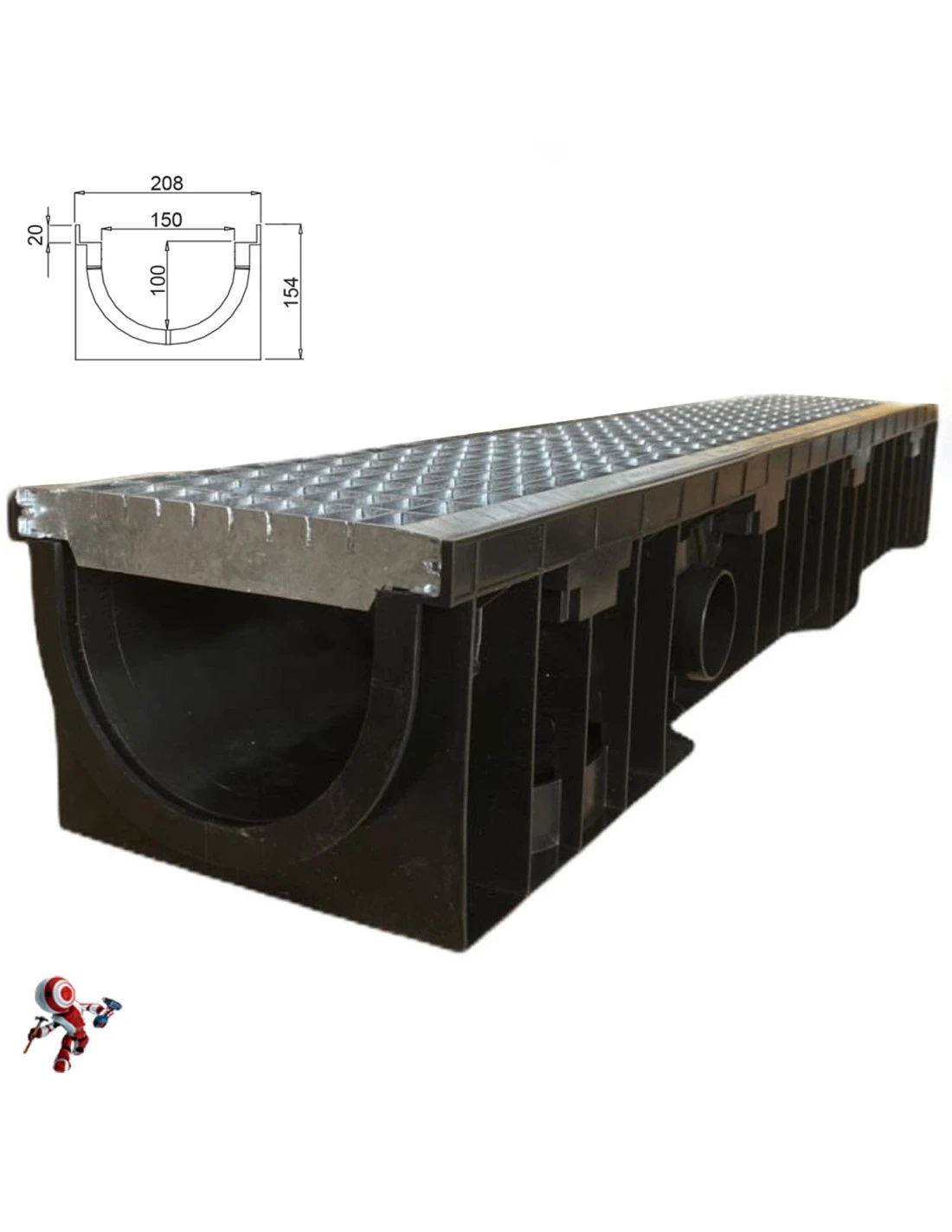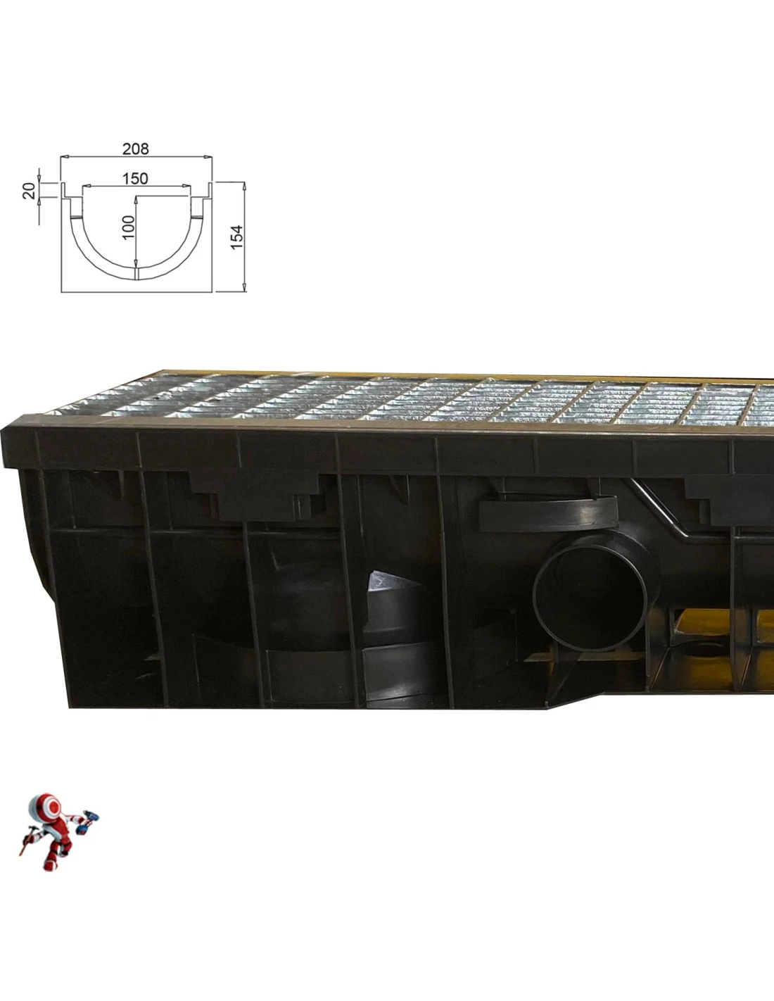 Canaletta di scolo acqua carrabile in POLIPROPILENE con griglia zincata 208×154 griglia scolo acqua piovana Ideale per interrati, garage e cortili, per il drenaggio di acque meteoriche o condensa