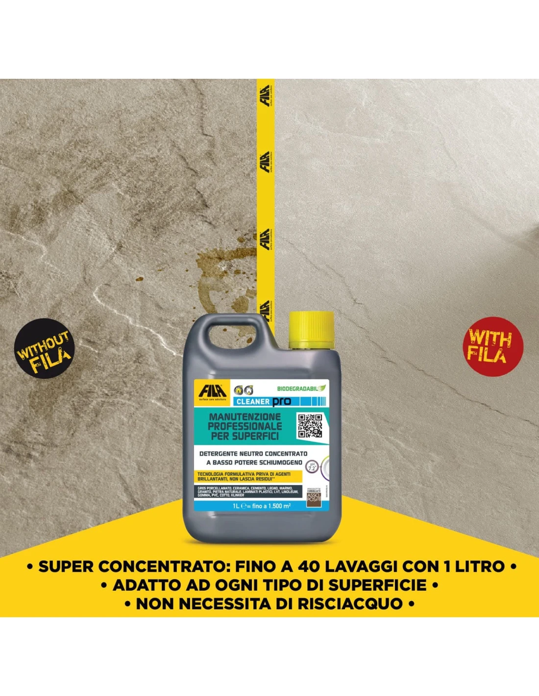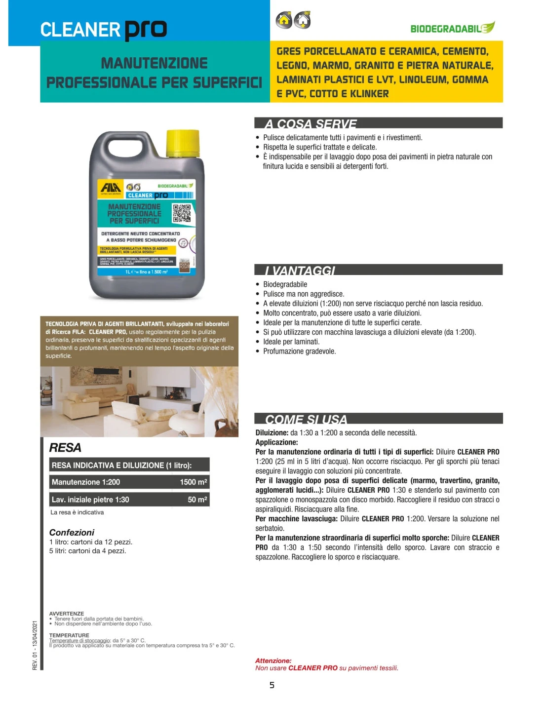- Manutenzione: Diluire CLEANER PRO 1:2001. Con 1 litro di prodotto, si possono pulire circa 1500 m².