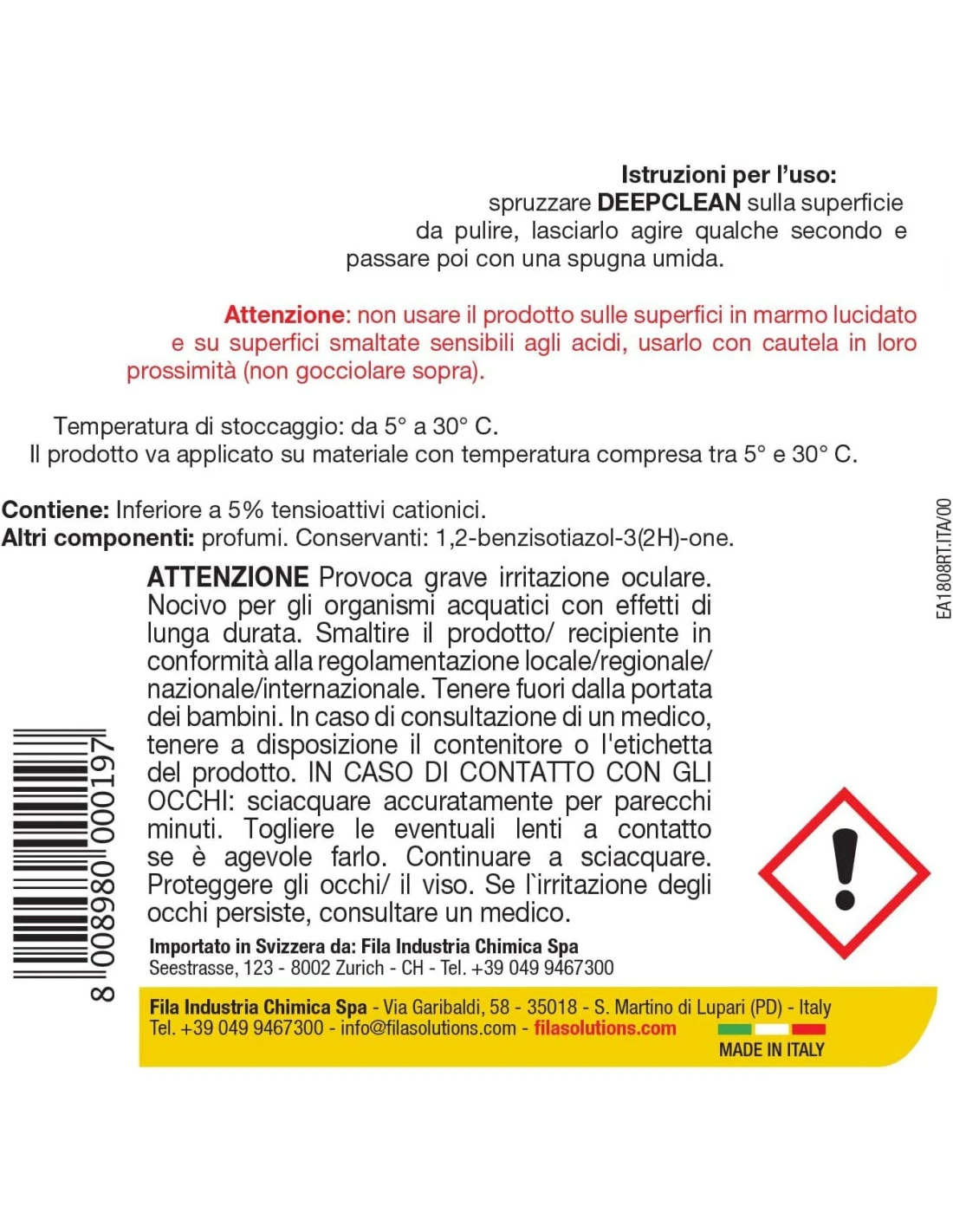 - Applicazione: Spruzzare DEEPCLEAN sulla superficie da pulire, lasciarlo agire qualche secondo e risciacquare bene poi con una spugna umida.