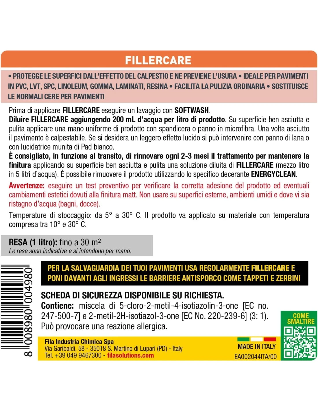 Il FILLERCARE è un trattamento protettivo progettato per diverse superfici, mirando a preservarle da usura e graffi, estendendo così la loro durata nel tempo. Ecco un riassunto dettagliato delle caratteristiche e dell’utilizzo di questo prodotto: