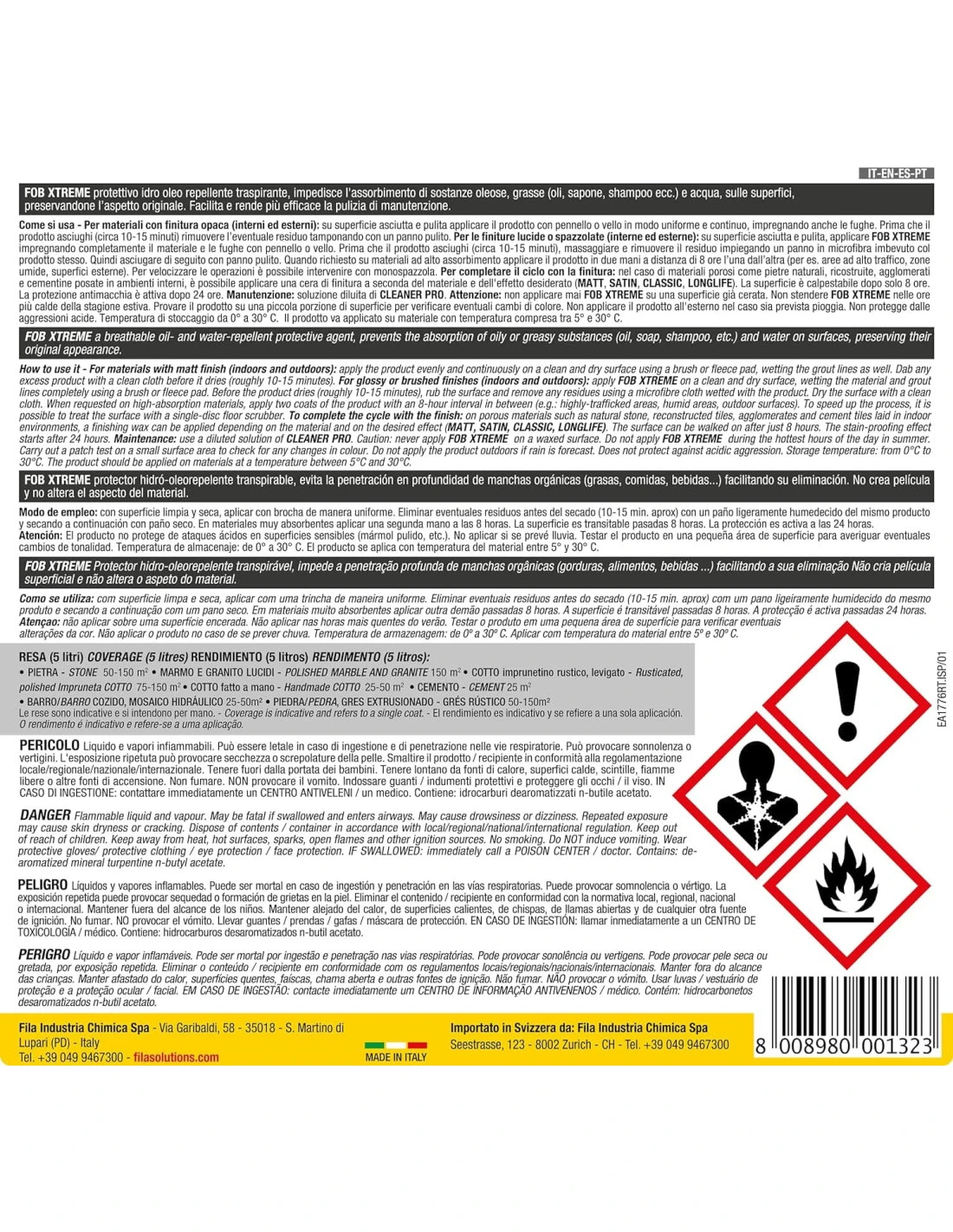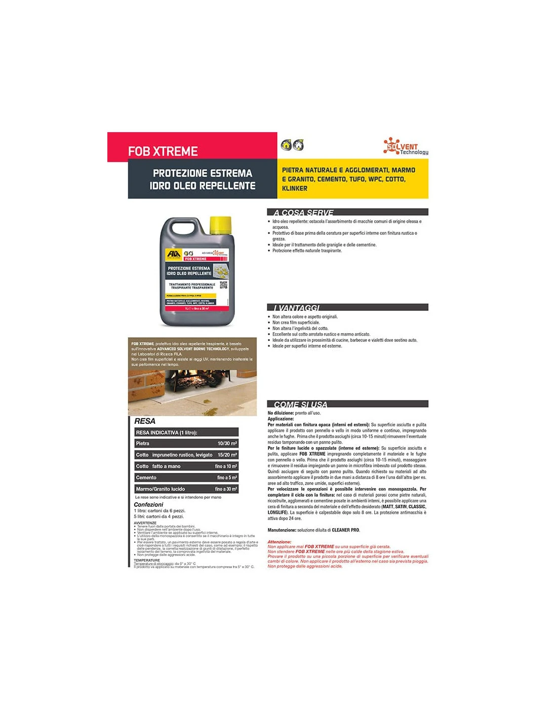 FOB XTREME è un prodotto di protezione estrema idro oleorepellente progettato per diverse superfici, offrendo numerosi benefici e vantaggi. Ecco un riassunto delle sue caratteristiche principali: