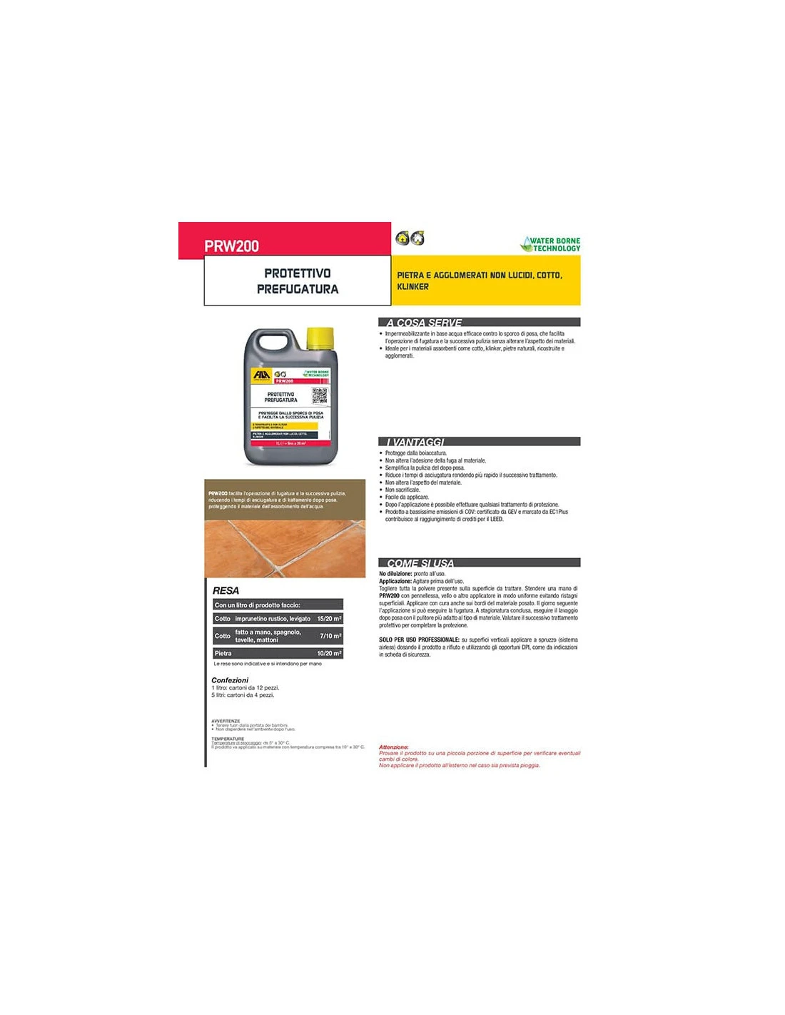 PRW200 è un prodotto impermeabilizzante in base acqua che facilita la fugatura e la pulizia dei materiali assorbenti come cotto, klinker, pietre naturali, ricostruite e agglomerati