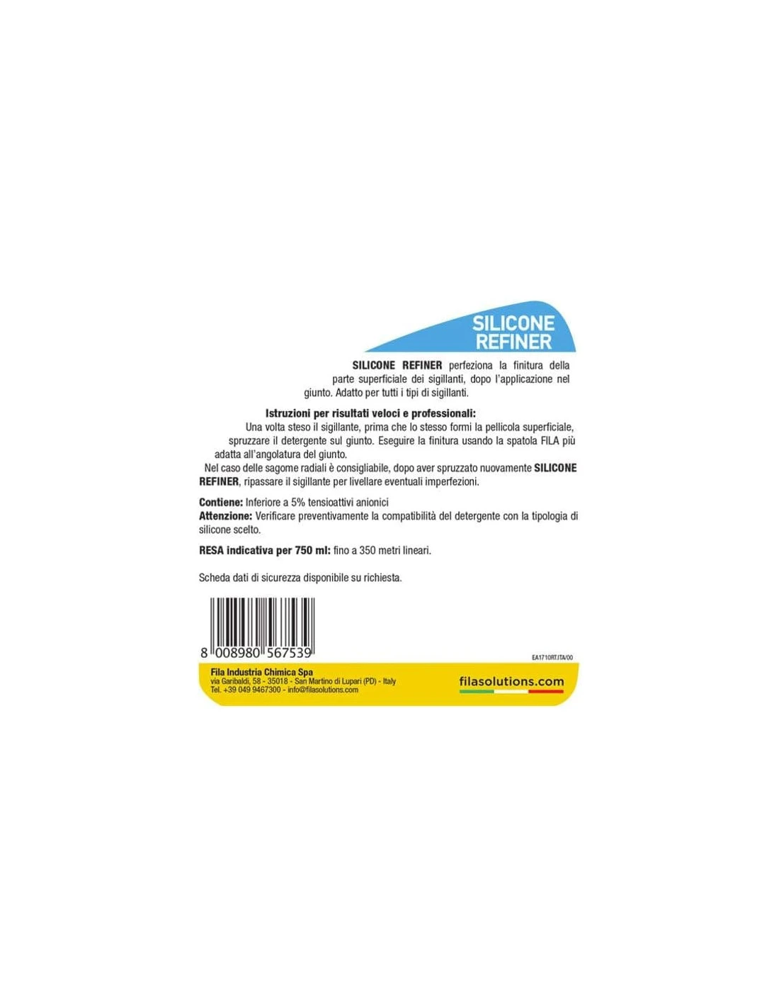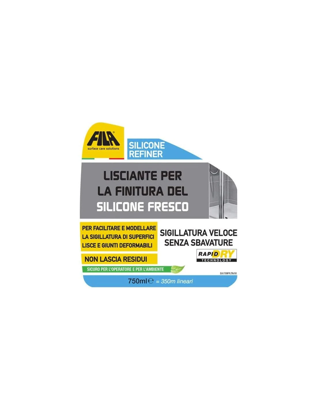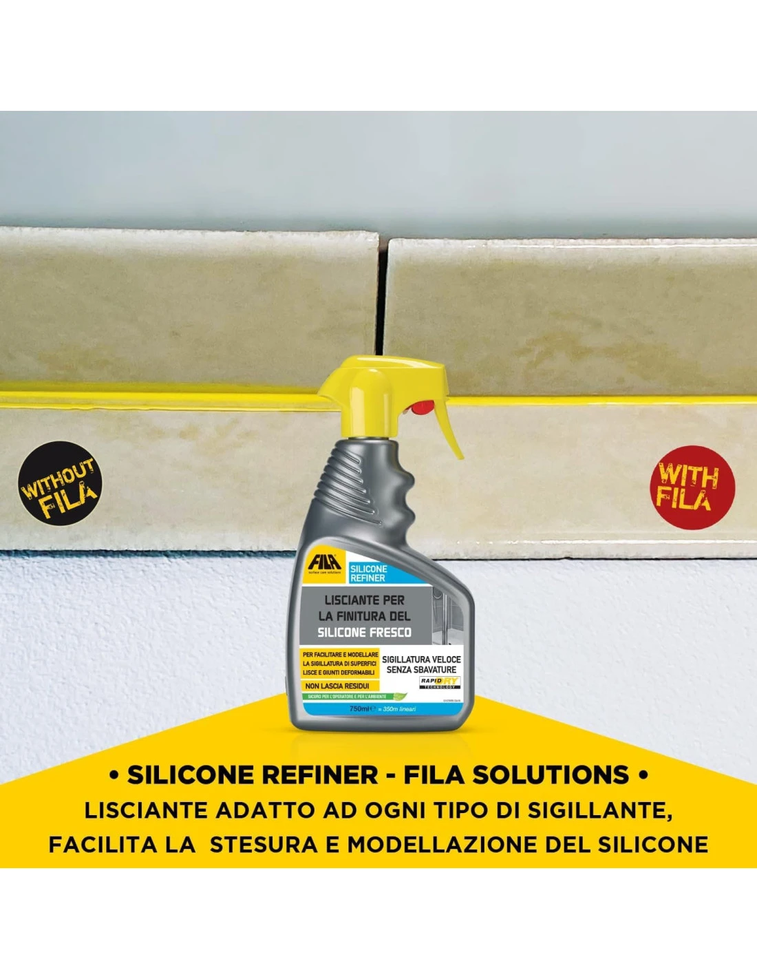 FILA Surface Care Solutions, SILICONE REFINER, Spray Lisciante Silicone, Adatto con Spatola Silicone e Raschietto Silicone, per la Finitura di Silicone Trasparente e ogni Tipo di Sigillante, 750ml