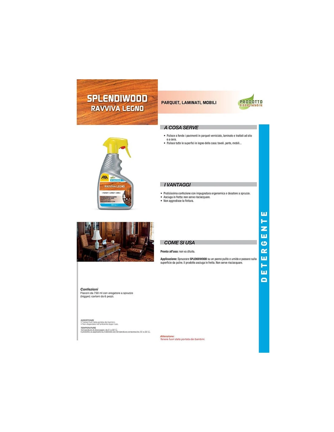 - Applicazione: spruzzare SPLENDIWOOD su un panno pulito e umido, quindi passare sulla superficie da pulire.