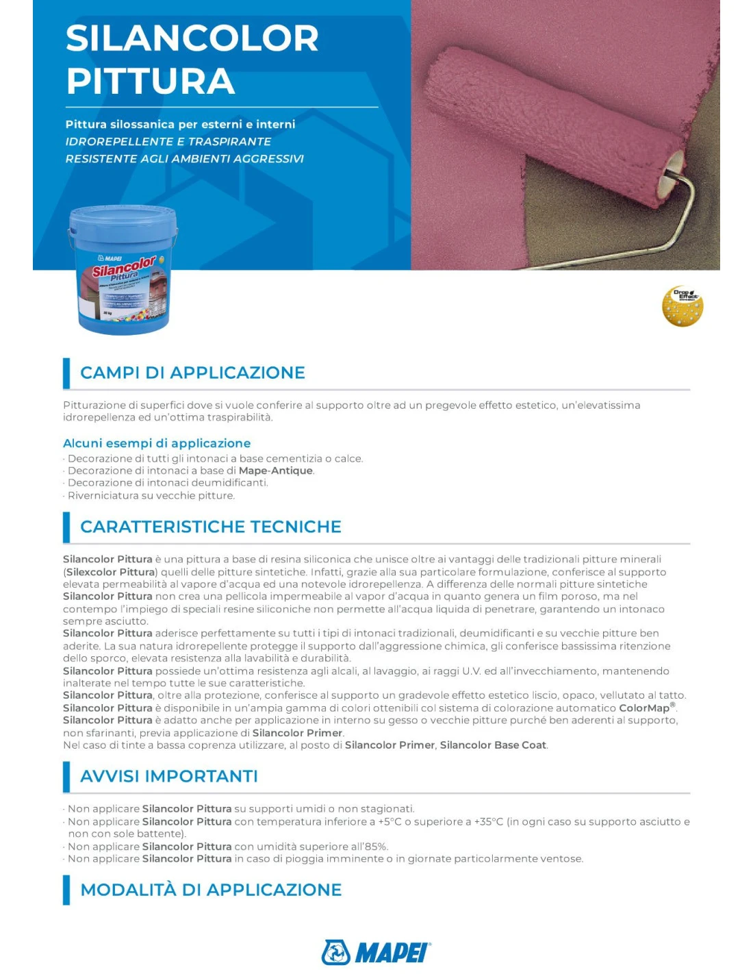 Mapei Silancolor Pittura è una pittura a base di resine silossaniche, studiata per fornire una finitura protettiva e decorativa alle superfici murali esterne ed interne. Grazie alla sua formulazione, offre eccellenti caratteristiche di traspirabilità e idrorepellenza.