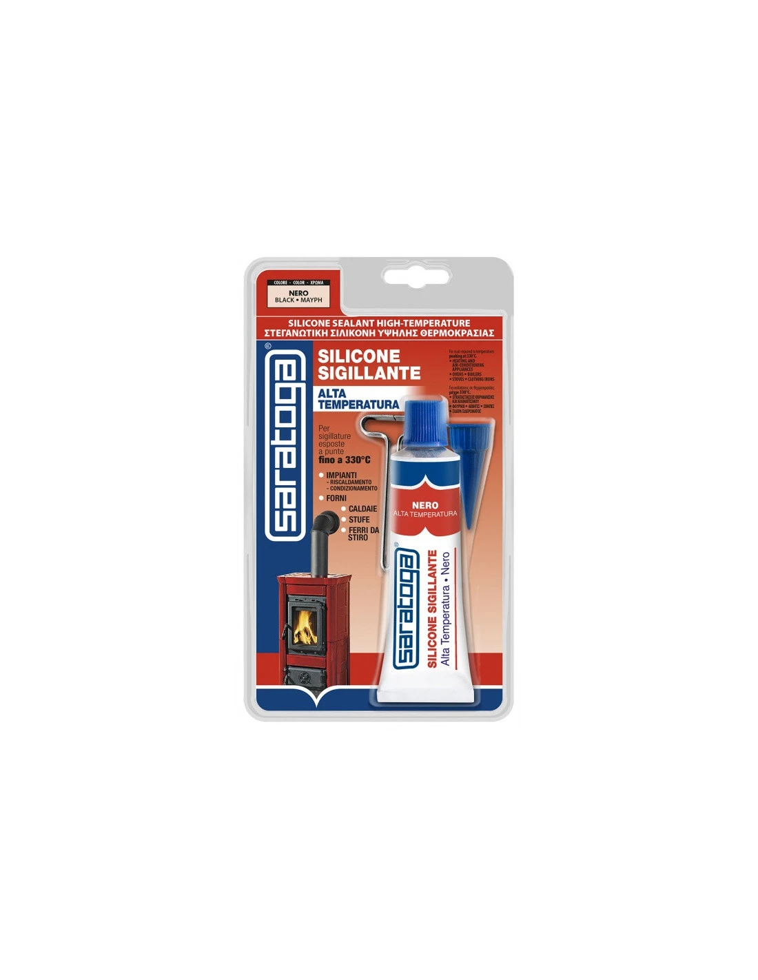 Saratoga Silicone Sigillante Alta Temperatura in blister è il silicone monocomponente a reticolazione acetica idoneo per impieghi da -60° a +260°C con punte sino a +330°C