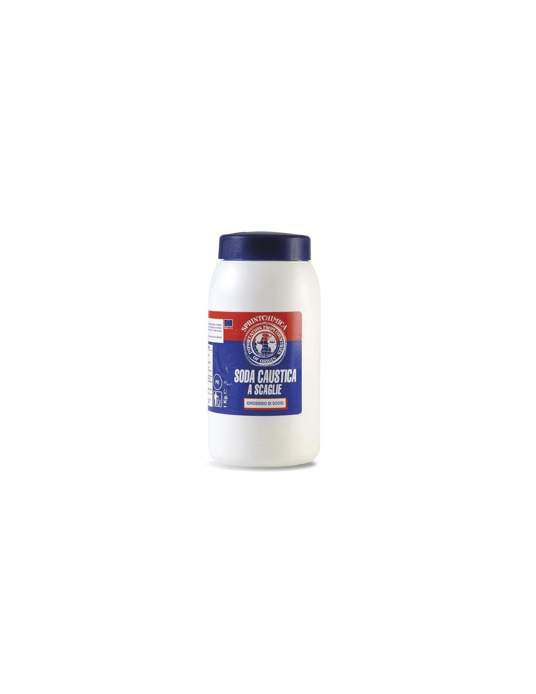 Soda caustica in scaglie. Per uso industriale e domestico. Con barattolo a norme CE.