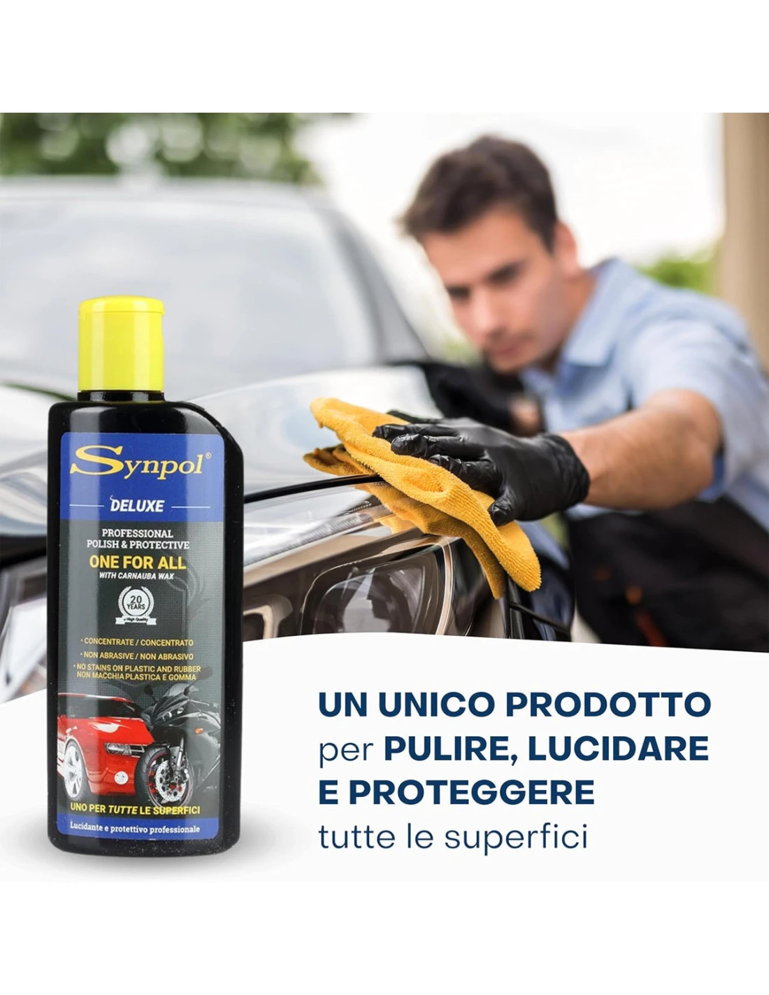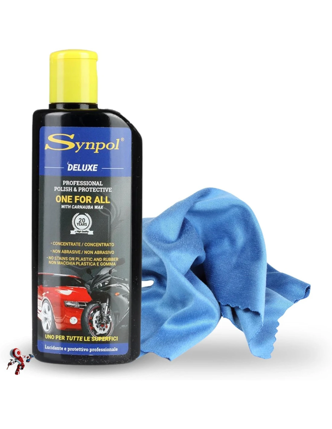 KIT 2 IN 1: Acquistando questo kit riceverai a casa due prodotti per lucidare e detergere la tua auto, moto, camper, caschi e così via. SYNPOL DELUXE 417 crema luc.prot 200ml e Synpol Panno Cleaner 32x32cm