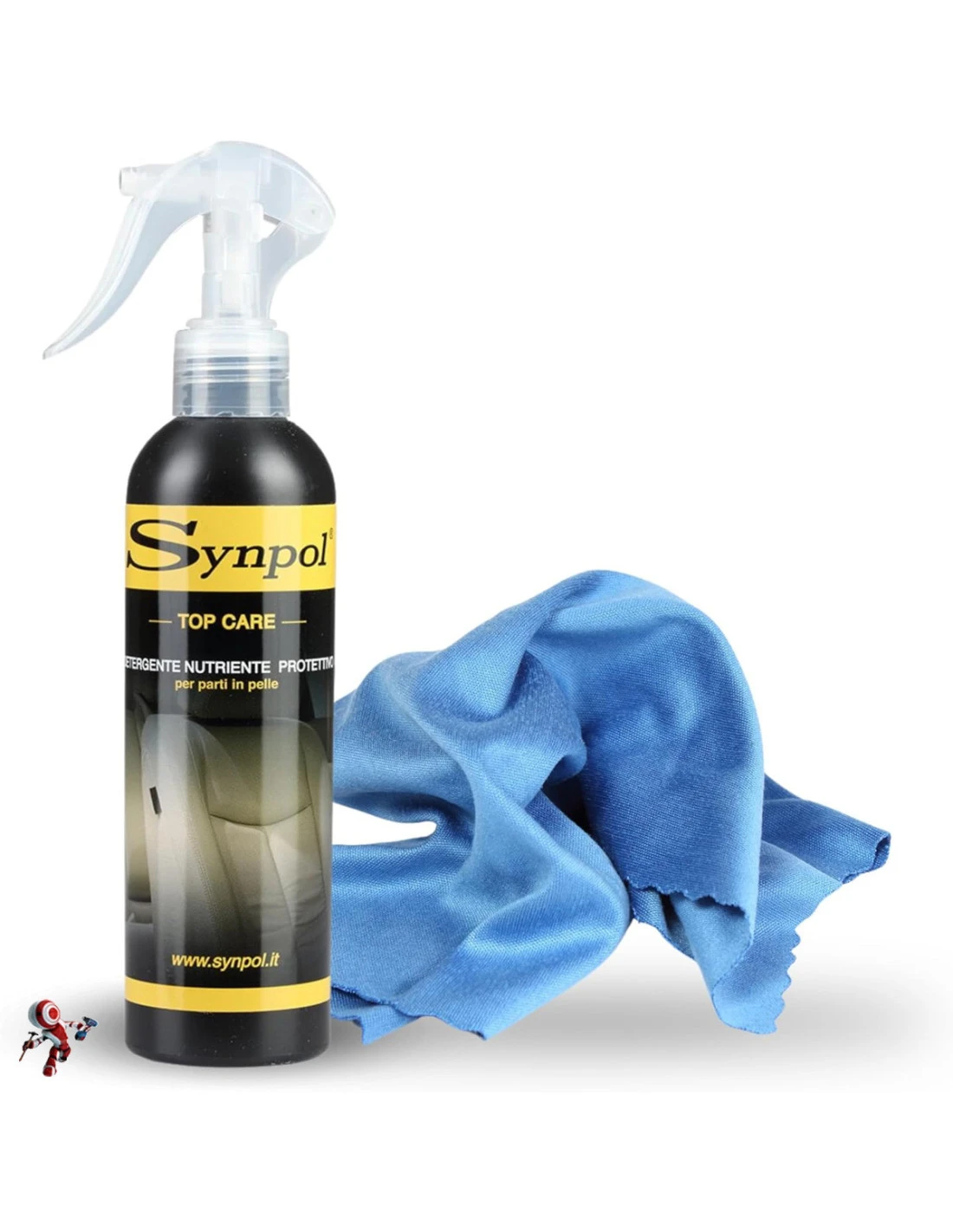 Synpol – Kit Detergente per Parti in Pelle più Panno in Microfibra – per Interni Auto – Effetto Brillantezza – Sella Moto – Non Lascia Aloni