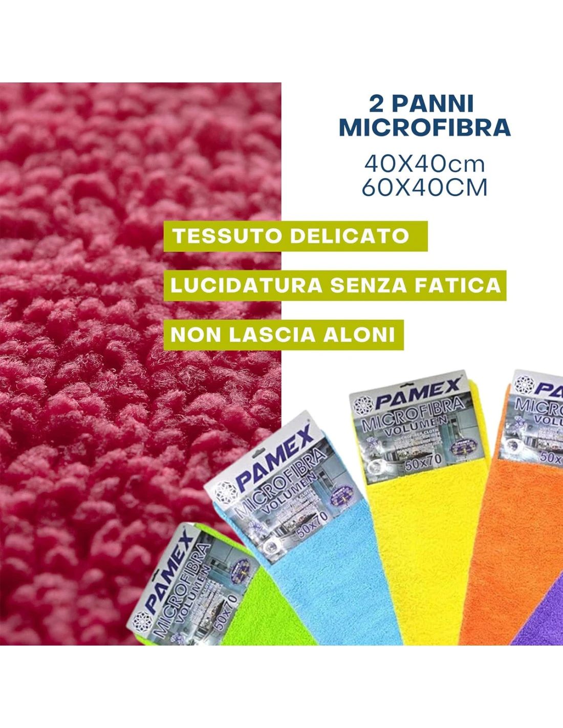 2 PANNI IN MICROFIBRA: Panno in microfibra ideale per la pulizia di qualsiasi superficie: vernice, vetri, plastica, specchi ecc. Permette di rimuovere facilmente unto e sporco, anche da superfici delicate senza lasciare aloni, impronte e pelucchi. Resistente e di lunga durata, lavabile.